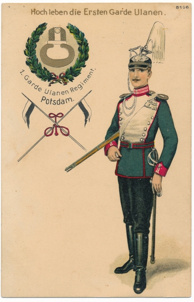 Text auf der Karte: 1. Garde-Ulanen-Regiment, Potsdam. Hoch leben die Ersten Garde Ulanen. Entstehungszeit der Karte: ca. 1910 Straße und Hausnummer: Ruinenbergstraße Kartenart: Ansichtskarte Kartentechnik: Kol. Litho Verlag: Militär-Kunstverlag: Carl Birn, Berlin S. 42 Gelaufen/ungelaufen: ungelaufen Zustand (I=sehr gut bis V=mangelhaft): I Häufigkeit (h=häufig bis rrr=sehr selten): r Heutige(r) Straßenname(n): Ruinenbergstraße