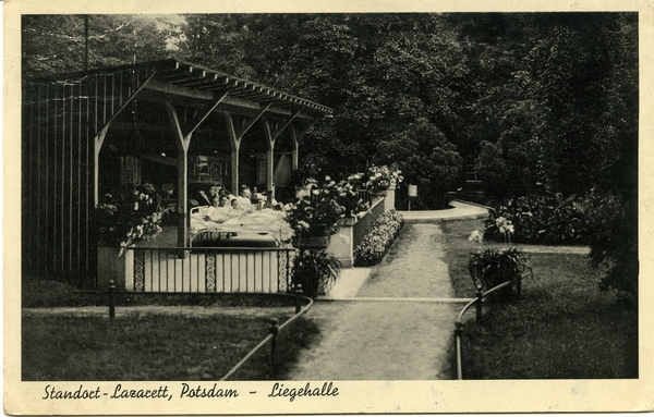 Text auf der Karte: Standort-Lazarett, Potsdam - Liegehalle Entstehungszeit der Karte: beschrieben 04.06.1938 (Marke entfernt) Kartenart: Ansichtskarte Kartentechnik: SW-Foto Verlag: Foto und Verlag Richard Opitz, Potsdam, Brandenburger Str. 63. 5106. Gelaufen/ungelaufen: gelaufen Zustand (I=sehr gut bis V=mangelhaft): II Häufigkeit (h=häufig bis rrr=sehr selten): h Kommentar: In den Jahren 1890-1894 wurde auf dem 4,86 ha großen ehemaligen Ackerfeld östlich des Ruinenberges ein gemeinsames Garnisonslazarett für sämtliche Truppenteile errichtet. Die bis dahin benutzten "Speziallazarette" gingen in das am 1. Oktober 1894 bezogene neue mit ein. Die Zusammenfassung der örtlichen Lazarette im neuen Objekt, begrenzt durch "Am Ruinenberg" (Pappelallee) und "Am Königsweg" (Voltaireweg), gewährleistete mit der damals modernsten Ausstattung an medizinischem und technischem Gerät eine optimale Betreuung der Kranken. Im einzelnen existierten in diesem 15 Gebäude umfassenden Komplex, neben den sicherstellenden Bereichen wie Verwaltung, Wirtschaft, Maschinen- und Kesselhaus, zweigeschossige Blöcke, einfache und Doppelbaracken und eine sogenannte Billroth'sche oder Wiener Baracke (Blöcke 4-10), ein Desinfektionshaus u.a. (Quelle: Bauer, Frank u. Knitter, Hartmut u. Ruppert, Heinz Vernichtet - Vergessen - Verdrängt Militärbauten und militärische Denkmäler in Potsdam, Verlag E. S. Mittler & Sohn, Berlin, Bonn, Herford, 1993, Seite 82 f.)