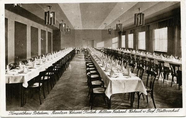 Text auf der Karte: Konzerthaus Potsdam, Besitzer Eduard Kutsch Mittlerer Festsaal Erbaut v. Prof. Kattwinkel Entstehungszeit der Karte: gestempelt Potsdam 23.03.1938 Straße und Hausnummer: Kaiser-Wilhelm-Straße 25-26 Kartenart: Ansichtskarte Kartentechnik: Kupfertiefdruck Verlag: Photo Alfred Krügelstein, Berlin-Wilmersdorf Gelaufen/ungelaufen: gelaufen Zustand (I=sehr gut bis V=mangelhaft): I Häufigkeit (h=häufig bis rrr=sehr selten): h Heutige(r) Straßenname(n): Hegelallee Kommentar: Seit 1869 trug das Gebäude den Namen "Thalia-Theater", später wurde es als Konzertsaal bezeichnet. Nach dem 2. Weltkrieg war das Gebäude das "Haus der Offiziere der sowjetischen Garnison in Potsdam". (nach Olaf Kühl und Hans-Werner Schneider)