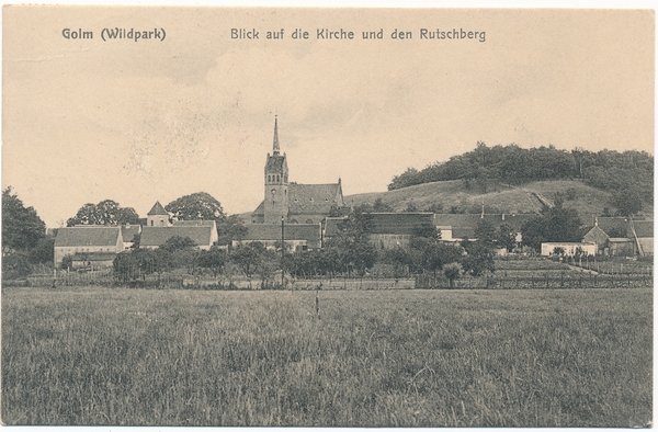 Text auf der Karte: Golm (Wildpark) Blick auf die Kirche und den Rutschberg Entstehungszeit der Karte: gestempelt Golm 29.09.1913 Kartenart: Ansichtskarte Kartentechnik: SW-Litho Verlag: MHP 743 Gelaufen/ungelaufen: gelaufen Zustand (I=sehr gut bis V=mangelhaft): I Häufigkeit (h=häufig bis rrr=sehr selten): h