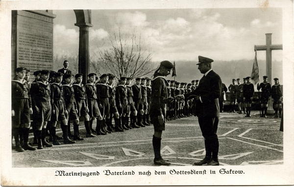 Text auf der Karte: Marinejugend Vaterland nach dem Gottesdienst in Sakrow. Rückseitig: Marinejugend Vaterland e.V. Berlin-Schöneberg, Feurigstr. 16 Entstehungszeit der Karte: ca. 1930 Kartenart: Ansichtskarte Kartentechnik: SW-Foto Verlag: unbekannt Gelaufen/ungelaufen: ungelaufen Zustand (I=sehr gut bis V=mangelhaft): II Häufigkeit (h=häufig bis rrr=sehr selten): h