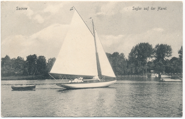 Text auf der Karte: Sacrow Segler auf der Havel Entstehungszeit der Karte: gestempelt Potsdam 14.03.1911 Kartenart: Ansichtskarte Kartentechnik: SW-Litho Verlag: HP 216. Gelaufen/ungelaufen: gelaufen Zustand (I=sehr gut bis V=mangelhaft): II Häufigkeit (h=häufig bis rrr=sehr selten): h