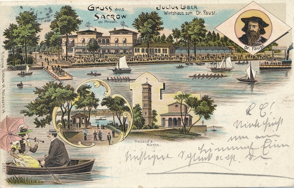 Text auf der Karte: Gruss aus Sacrow bei Potsdam Julius Leber Wirtshaus zum Dr. Faust Entstehungszeit der Karte: gestempelt Klein-Glienicke ca. 1901 Kartenart: Ansichtskarte Kartentechnik: Kol. Litho Verlag: R. Hanow, Berlin W., Pallasstr. 14 Gelaufen/ungelaufen: gelaufen Zustand (I=sehr gut bis V=mangelhaft): II Häufigkeit (h=häufig bis rrr=sehr selten): h Heutige(r) Straßenname(n): Am Meedehorn Kommentar: Das Fährhaus Restaurant Dr. Faust ist benannt nach seinem früheren Besitzer, der wohl durch Goethe zu seinem Titel gekommen war. Das Restaurant blieb als Ruine bis in die 1970er Jahre erhalten und wurde dann abgerissen, weil es den Grenzanlagen im Wege war. (Quelle: Köhler, Jan Thomas / Maruhn, Jan Sacrow Vom märkischen Dorf zum Ort der Moderne, Berlin 2005, Seite 25, 51 f.)