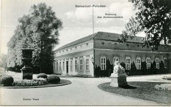 Text auf der Karte: Sanssouci-Potsdam Drake-Vase Wohnung des Amtsvorstehers Entstehungszeit der Karte: ca. 1910 Straße und Hausnummer: Park Sanssouci Kartenart: Ansichtskarte Kartentechnik: Kupfertiefdruck Verlag: R. Steinbrück, Wannsee-Berlin W. Gelaufen/ungelaufen: ungelaufen Zustand (I=sehr gut bis V=mangelhaft): I Häufigkeit (h=häufig bis rrr=sehr selten): r