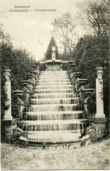 Text auf der Karte: Sanssouci Paradiesgarten - Treppenfontaine Entstehungszeit der Karte: gestempelt Potsdam 12.04.1920 Straße und Hausnummer: Park Sanssouci Kartenart: Ansichtskarte Kartentechnik: SW-Litho Verlag: R. Steinbrück, Sanssouci Gelaufen/ungelaufen: gelaufen Zustand (I=sehr gut bis V=mangelhaft): I Häufigkeit (h=häufig bis rrr=sehr selten): h