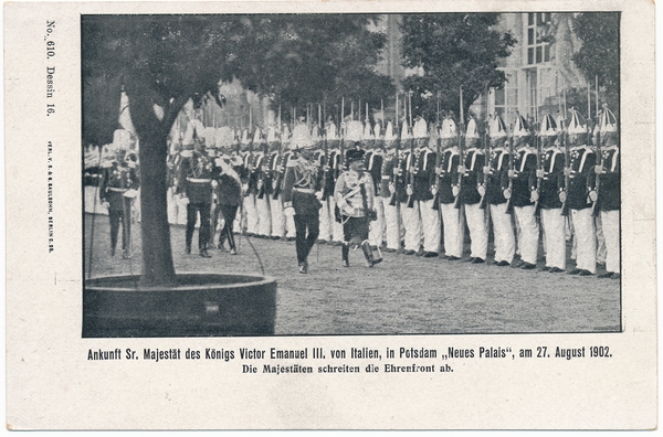 Text auf der Karte: Ankunft Sr. Majestät des Königs Victor Emanuel III. von Italien, in Potsdam "Neues Palais", am 27. August 1902. Die Majestäten schreiten die Front ab. Entstehungszeit der Karte: ca. 1902 Straße und Hausnummer: Park Sanssouci Kartenart: Ansichtskarte Kartentechnik: SW-Litho Verlag: No. 610. Dessin 16. Verl. V. S. G. Saulsohn, Berlin C. 25. Gelaufen/ungelaufen: ungelaufen Zustand (I=sehr gut bis V=mangelhaft): I Häufigkeit (h=häufig bis rrr=sehr selten): h
