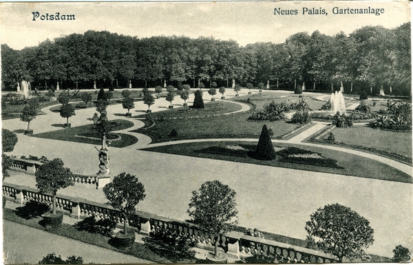 Text auf der Karte: Potsdam Neues Palais, Gartenanlage Entstehungszeit der Karte: gestempelt 29.09.1915 Straße und Hausnummer: Park Sanssouci Kartenart: Ansichtskarte Kartentechnik: SW-Litho Verlag: No. 1003/11 Gelaufen/ungelaufen: Feldpost Zustand (I=sehr gut bis V=mangelhaft): II Häufigkeit (h=häufig bis rrr=sehr selten): h