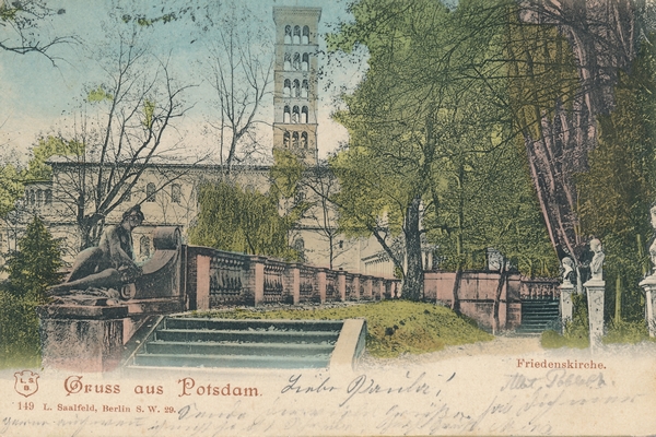 Text auf der Karte: Gruss aus Potsdam. Friedenskirche. Entstehungszeit der Karte: gestempelt Potsdam 10.09.1900 Straße und Hausnummer: Park Sanssouci Kartenart: Ansichtskarte Kartentechnik: kol. Litho Verlag: 149 L. Saalfeld, Berlin S. W. 29. Gelaufen/ungelaufen: gelaufen Zustand (I=sehr gut bis V=mangelhaft): I Häufigkeit (h=häufig bis rrr=sehr selten): h