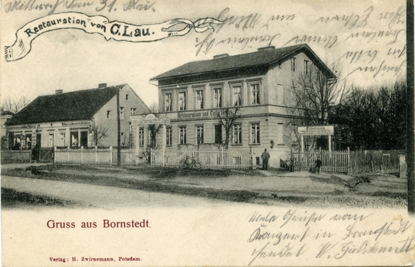 Text auf der Karte: Gruss aus Bornstedt Restauration von C. Lau (Carl Lau) Entstehungszeit der Karte: gestempelt Bornstedt (Mark) 01.06.1905 Kartenart: Ansichtskarte Kartentechnik: SW-Litho Verlag: Verlag: H. Zwirnemann, Potsdam. Gelaufen/ungelaufen: gelaufen Zustand (I=sehr gut bis V=mangelhaft): I Häufigkeit (h=häufig bis rrr=sehr selten): h