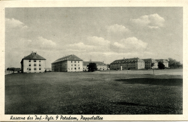 Text auf der Karte: Kaserne des Inf.-Rgts. 9 Potsdam, Pappelallee Entstehungszeit der Karte: ca. 1930 Straße und Hausnummer: Pappelallee Kartenart: Ansichtskarte Kartentechnik: SW-Foto Verlag: Verlag Richard Opitz, Photograph, Potsdam, Tel. 5106 Gelaufen/ungelaufen: ungelaufen Zustand (I=sehr gut bis V=mangelhaft): I Häufigkeit (h=häufig bis rrr=sehr selten): h Heutige(r) Straßenname(n): Pappelallee (Bornstedt) Kommentar: In der Kaserne befindet sich heute die Fachhochschule Potsdam. (Quelle: Knitter, Hartmut / Lamprecht, Rainer Rund um das Bornstedter Feld - Streiflichter zur Geschichte des Potsdamer Nordraumes, Potsdam 2006, Seite 160 ff.)