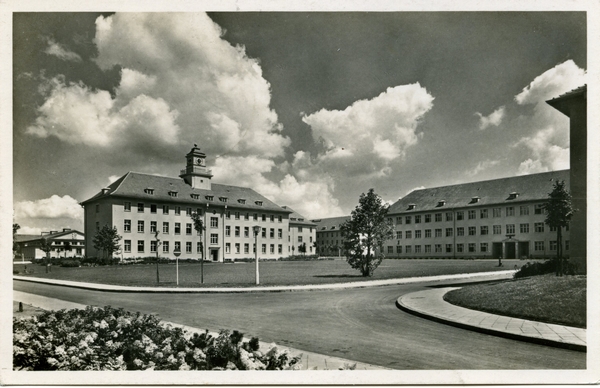 Text auf der Karte: Kriegsschule Potsdam Stabshaus und Lehrgebäude Entstehungszeit der Karte: gestempelt 13.10.1940 Straße und Hausnummer: Kirschallee Kartenart: Ansichtskarte Kartentechnik: SW-Foto Verlag: 2151. Max Baur Verlag, Potsdam Gelaufen/ungelaufen: Feldpost Zustand (I=sehr gut bis V=mangelhaft): I Häufigkeit (h=häufig bis rrr=sehr selten): h Heutige(r) Straßenname(n): Kirschallee Kommentar: Bereits 1934 setzten am südwestlichen Rand des Bornstedter Feldes die Bauarbeiten für die neue Potsdamer Kriegsschule ein. Die Eröffnung erfolgte am 9. Januar 1936. (Quelle: Knitter, Hartmut / Lamprecht, Rainer Rund um das Bornstedter Feld - Streiflichter zur Geschichte des Potsdamer Nordraumes, Potsdam 2006, Seite 162 ff.)