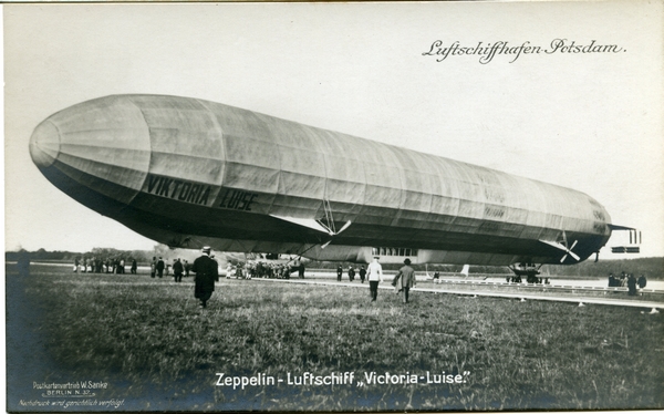 Text auf der Karte: Luftschiffhafen Potsdam. Zeppelin-Luftschiff "Victoria-Luise". Entstehungszeit der Karte: ca. 1913 Straße und Hausnummer: Am Templiner See Kartenart: Ansichtskarte Kartentechnik: SW-Foto Verlag: Postkartenvertrieb W. Sanke Berlin N 37 Gelaufen/ungelaufen: ungelaufen Zustand (I=sehr gut bis V=mangelhaft): I Häufigkeit (h=häufig bis rrr=sehr selten): r Heutige(r) Straßenname(n): Am Luftschiffhafen Kommentar: Am 09.09.1911 landet das erste Luftschiff im Potsdamer Luftschiffhafen. Im November 1912 wird die größte Luftschiffhalle der Welt auf der Zeppelinwerft in Potsdam fertiggestellt. 1922 erfolgt der Abbruch der Halle und der Werft.