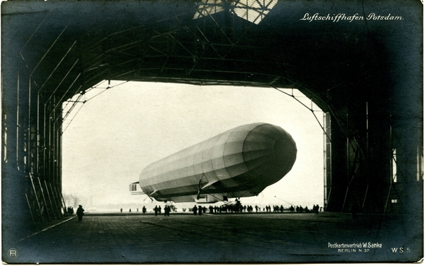 Text auf der Karte: Luftschiffhafen Potsdam. W.S.5 Entstehungszeit der Karte: ca. 1913 Straße und Hausnummer: Am Templiner See Kartenart: Ansichtskarte Kartentechnik: SW-Foto Verlag: Postkartenvertrieb W. Sanke Berlin N 37 Gelaufen/ungelaufen: ungelaufen Zustand (I=sehr gut bis V=mangelhaft): II Häufigkeit (h=häufig bis rrr=sehr selten): r Heutige(r) Straßenname(n): Am Luftschiffhafen Kommentar: Am 09.09.1911 landet das erste Luftschiff im Potsdamer Luftschiffhafen. Im November 1912 wird die größte Luftschiffhalle der Welt auf der Zeppelinwerft in Potsdam fertiggestellt. 1922 erfolgt der Abbruch der Halle und der Werft.