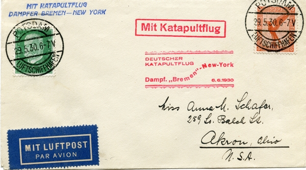 Text auf der Karte: Kuvert mit Katapultflug und dem Dampfer Bremen nach New York Entstehungszeit der Karte: gestempelt Potsdam Luftschiffhafen 29.05.1930 Kartenart: Kuvert Kartentechnik: Rotations-Tiefdruck Verlag: unbekannt Gelaufen/ungelaufen: gelaufen Zustand (I=sehr gut bis V=mangelhaft): I Häufigkeit (h=häufig bis rrr=sehr selten): rr Kommentar: Durch die Kombination von Flugzeugen und Schiffen konnte die Postlaufzeit signifikant verkürzt werden. Die Flugzeuge flogen zu diesem Zweck hinter einem Schiff her und wurden an Deck gezogen. Kurz vor dem Ziel wurden die Flugzeuge mit Pressluft vom Schiff katapultiert und konnten so das letzte Stück zum Ziel wiederum verkürzen. Die Bezeichnung Katapultflug wurde 1931 in Schleuderflug geändert.
