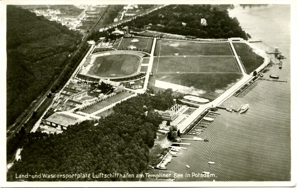 Text auf der Karte: Land- und Wassersportplatz Luftschiffhafen am Templiner See in Potsdam. Entstehungszeit der Karte: geschrieben 16.02.1942 Straße und Hausnummer: Am Templiner See Kartenart: Ansichtskarte Kartentechnik: SW-Foto Verlag: Verlag Piek, Potsdam Gelaufen/ungelaufen: gelaufen Zustand (I=sehr gut bis V=mangelhaft): II Häufigkeit (h=häufig bis rrr=sehr selten): r Heutige(r) Straßenname(n): Am Luftschiffhafen Kommentar: Am 09.09.1911 landet das erste Luftschiff im Potsdamer Luftschiffhafen. Im November 1912 wird die größte Luftschiffhalle der Welt auf der Zeppelinwerft in Potsdam fertiggestellt. 1922 erfolgt der Abbruch der Halle und der Werft.