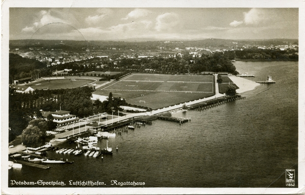 Text auf der Karte: Potsdam-Sportplatz, Luftschiffhafen. Regattahaus rückseitig: Inh. Otto Haupt - Potsdam Tel. 2535 Entstehungszeit der Karte: gestempelt Potsdam 14.04.1936 Straße und Hausnummer: Am Templiner See Kartenart: Ansichtskarte Kartentechnik: SW-Foto Verlag: Industrie=Fotografen Klinke & Co., Berlin W 8, Leipziger Str. 24 Gelaufen/ungelaufen: gelaufen Zustand (I=sehr gut bis V=mangelhaft): I Häufigkeit (h=häufig bis rrr=sehr selten): h Heutige(r) Straßenname(n): Am Luftschiffhafen Kommentar: 1925 erfolgt die Anlage des "Land- und Wassersportplatzes Luftschiffhafen".