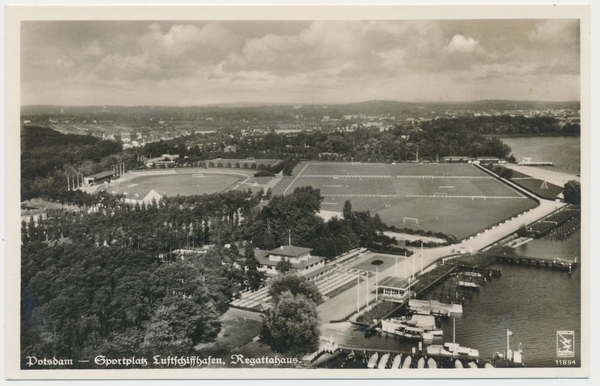 Text auf der Karte: Potsdam-Sportplatz Luftschiffhaben, Regattahaus Entstehungszeit der Karte: ca. 1935 Straße und Hausnummer: Am Templiner See Kartenart: Ansichtskarte Kartentechnik: SW-Foto Verlag: Industrie=Fotografen Klinke & Co., Berlin W 8, Leipziger Str. 24 Gelaufen/ungelaufen: ungelaufen Zustand (I=sehr gut bis V=mangelhaft): I Häufigkeit (h=häufig bis rrr=sehr selten): h Heutige(r) Straßenname(n): Am Luftschiffhafen Kommentar: 1925 erfolgt die Anlage des "Land- und Wassersportplatzes Luftschiffhafen".