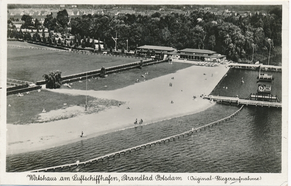 Text auf der Karte: Wirtshaus am Luftschiffhafen, Strandbad Potsdam (Original-Fliegeraufnahme) Entstehungszeit der Karte: gestempelt Berlin Charlottenburg 06.06.1938 Straße und Hausnummer: Am Templiner See Kartenart: Ansichtskarte Kartentechnik: SW-Foto Verlag: Graphische Kunstanstalt Max O'Brien, Berlin-Steglitz, Plantagenstraße 3 Gelaufen/ungelaufen: gelaufen Zustand (I=sehr gut bis V=mangelhaft): II Häufigkeit (h=häufig bis rrr=sehr selten): h Heutige(r) Straßenname(n): Am Luftschiffhafen Kommentar: 1925 erfolgt die Anlage des "Land- und Wassersportplatzes Luftschiffhafen".