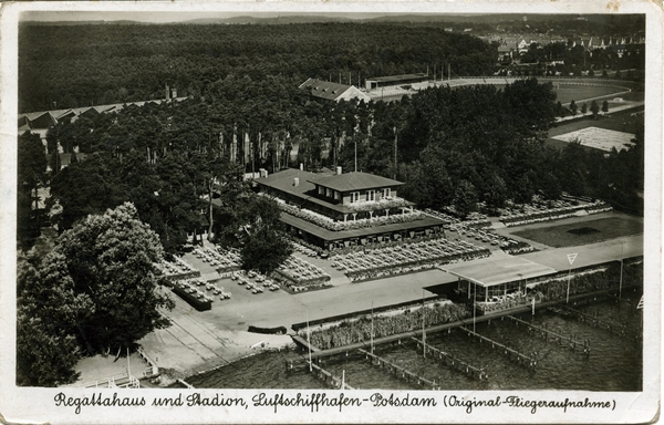 Text auf der Karte: Regattahaus und Stadion, Luftschiffhafen-Potsdam (Original-Fliegeraufnahme) Entstehungszeit der Karte: ca. 1930 Straße und Hausnummer: Am Templiner See Kartenart: Ansichtskarte Kartentechnik: SW-Foto Verlag: Graphische Kunstanstalt Max O'Brien, Berlin-Steglitz, Plantagenstraße 3 Gelaufen/ungelaufen: gelaufen Zustand (I=sehr gut bis V=mangelhaft): III Häufigkeit (h=häufig bis rrr=sehr selten): h Heutige(r) Straßenname(n): Am Luftschiffhafen Kommentar: 1925 erfolgt die Anlage des "Land- und Wassersportplatzes Luftschiffhafen".