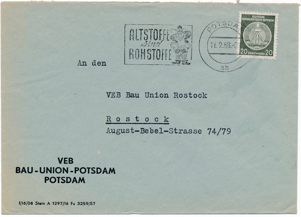 Text auf der Karte: VEB Bau-Union-Potsdam Potsdam Entstehungszeit der Karte: gestempelt Potsdam 11.02.1958 Straße und Hausnummer: Leninallee Kartenart: Kuvert Kartentechnik: Druck Verlag: unbekannt Gelaufen/ungelaufen: gelaufen Zustand (I=sehr gut bis V=mangelhaft): I Häufigkeit (h=häufig bis rrr=sehr selten): h Heutige(r) Straßenname(n): Am Luftschiffhafen