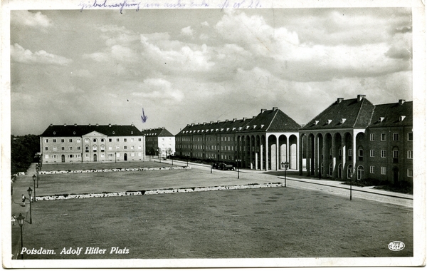 Text auf der Karte: Potsdam. Adolf Hitler Platz Entstehungszeit der Karte: gestempelt 11.03.1939 Straße und Hausnummer: Adolf Hitler Platz Kartenart: Ansichtskarte Kartentechnik: SW-Foto Verlag: Nr. 413 Kunstverlag Robert Hügel, Berlin SW 29 Gelaufen/ungelaufen: gelaufen Zustand (I=sehr gut bis V=mangelhaft): II Häufigkeit (h=häufig bis rrr=sehr selten): h Heutige(r) Straßenname(n): Schillerplatz Kommentar: Die Siedlung Schillerplatz (Friedrichsstadt, benannt nach dem Oberbürgermeister Hans Friedrichs) mit 500 Wohnungen wurde in den Jahren 1935-1938 erbaut.