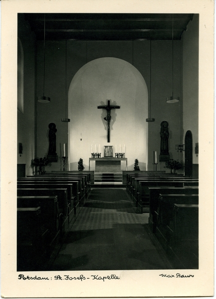 Text auf der Karte: Potsdam: St. Josefs-Kapelle Max Baur Entstehungszeit der Karte: ca. 1935 Straße und Hausnummer: Allee nach Sanssouci Kartenart: Fotokarte Kartentechnik: SW-Foto Verlag: Reg. Nr.05 Gelaufen/ungelaufen: ungelaufen Zustand (I=sehr gut bis V=mangelhaft): I Häufigkeit (h=häufig bis rrr=sehr selten): h Heutige(r) Straßenname(n): Allee nach Sanssouci