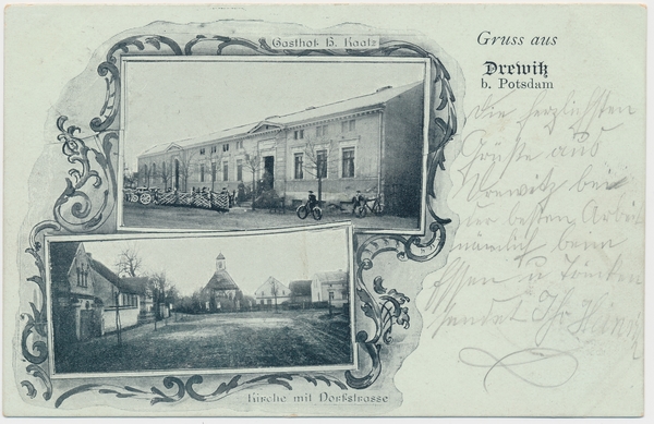 Text auf der Karte: Gruss aus Drewitz b. Potsdam Gasthof H. Kaatz Kirche mit Dorfstrasse Entstehungszeit der Karte: gestempelt Drewitz Bz. Potsdam 22.05.1900 Kartenart: Ansichtskarte Kartentechnik: SW-Litho Verlag: unbekannt Gelaufen/ungelaufen: gelaufen Zustand (I=sehr gut bis V=mangelhaft): I Häufigkeit (h=häufig bis rrr=sehr selten): rr