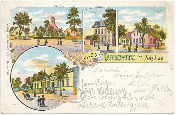 Text auf der Karte: Gruss aus Drewitz bei/ Potsdam. Entstehungszeit der Karte: gestempelt Drewitz 07.09.1903 Kartenart: Ansichtskarte Kartentechnik: Farblitho Verlag: Verlag von Julius Pfeiffer, Berlin O. 27 Gelaufen/ungelaufen: gelaufen Zustand (I=sehr gut bis V=mangelhaft): III Häufigkeit (h=häufig bis rrr=sehr selten): h