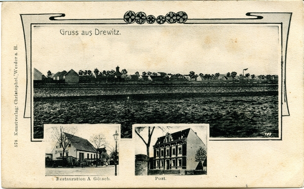 Text auf der Karte: Gruss aus Drewitz. Restauration A. Götsch. Post. Entstehungszeit der Karte: gestempelt Drewitz (Bz Potsdam) 23.07.1907 Kartenart: Ansichtskarte Kartentechnik: SW-Litho Verlag: 578. Kunstverlag: Christophel Werder a. H. Gelaufen/ungelaufen: gelaufen Zustand (I=sehr gut bis V=mangelhaft): II Häufigkeit (h=häufig bis rrr=sehr selten): r