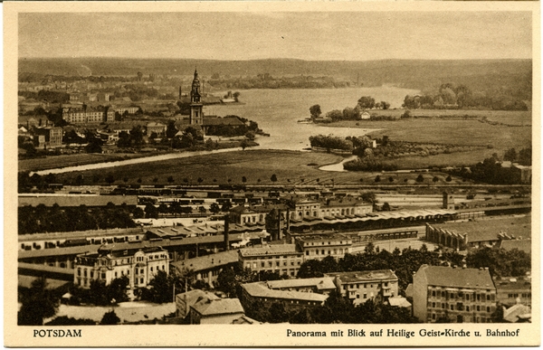 Text auf der Karte: POTSDAM Panorama mit Blick auf Heilige Geist-Kirche u. Bahnhof Entstehungszeit der Karte: ca. 1920 Kartenart: Ansichtskarte Kartentechnik: Kupfertiefdruck Verlag: Kunstverlag J. Goldiner, Berlin C. 25. Orig.-Aufn. Gelaufen/ungelaufen: ungelaufen Zustand (I=sehr gut bis V=mangelhaft): I Häufigkeit (h=häufig bis rrr=sehr selten): r