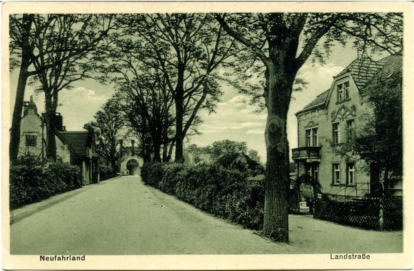 Text auf der Karte: Neufahrland Landstraße Entstehungszeit der Karte: ca. 1920 Kartenart: Ansichtskarte Kartentechnik: SW-Litho Verlag: Kunstverlag W. Meyerheim, Berlin O. 17. Gelaufen/ungelaufen: ungelaufen Zustand (I=sehr gut bis V=mangelhaft): I Häufigkeit (h=häufig bis rrr=sehr selten): h Heutige(r) Straßenname(n): Tschudistraße