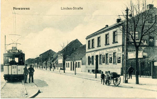 Text auf der Karte: Nowawes Linden-Strasse Entstehungszeit der Karte: ca. 1918 Straße und Hausnummer: Lindenstraße (Babelsberg) 1 Kartenart: Ansichtskarte Kartentechnik: SW-Litho Verlag: Kunstverlag J. Goldiner, Berlin C. 25. Orig.-Aufn. Gelaufen/ungelaufen: ungelaufen Zustand (I=sehr gut bis V=mangelhaft): I Häufigkeit (h=häufig bis rrr=sehr selten): r Heutige(r) Straßenname(n): Rudolf-Breitscheid-Straße Kommentar: Endhaltestelle der seit dem 17. Oktober 1908 zwischen Potsdam (Wilhelmplatz) und Nowawes (Plantagenstraße) fahrenden elektrischen Straßenbahn vor dem "Gasthof zum Preussischen Hof" in der Lindenstr. 1. (Quelle: Potsdam-Museum (Herausgeber) Neuendorf - Nowawes - Babelsberg auf historischen Ansichtskarten, Potsdam 2004, Seite 32)