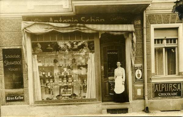 Text auf der Karte: Geschäft von Antonie Schön (Inh. Hertha Feige) Entstehungszeit der Karte: gestempelt Nowawes 19.09.1915 Straße und Hausnummer: Priesterstraße (Babelsberg) 40c (44) Kartenart: Fotokarte Kartentechnik: SW-Foto Verlag: Kaeschner, Ernst, Photografische Kunst-Anstalt, Berlin-Waidmannslust. Gelaufen/ungelaufen: gelaufen Zustand (I=sehr gut bis V=mangelhaft): I Häufigkeit (h=häufig bis rrr=sehr selten): rrr Heutige(r) Straßenname(n): Karl-Liebknecht-Straße (Babelsberg-Nord)
