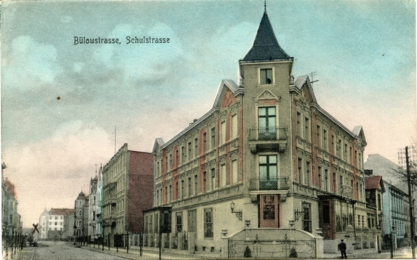 Text auf der Karte: Bülowstrasse, Schulstrasse Entstehungszeit der Karte: ca. 1905 Straße und Hausnummer: Bülowstraße, Schulstraße Kartenart: Ansichtskarte Kartentechnik: Kol. Litho Verlag: 9175. Kaufhaus Bernhard Lehmann Gelaufen/ungelaufen: ungelaufen Zustand (I=sehr gut bis V=mangelhaft): I Häufigkeit (h=häufig bis rrr=sehr selten): rr Heutige(r) Straßenname(n): Wattstraße Schulstraße (Babelsberg-Süd)