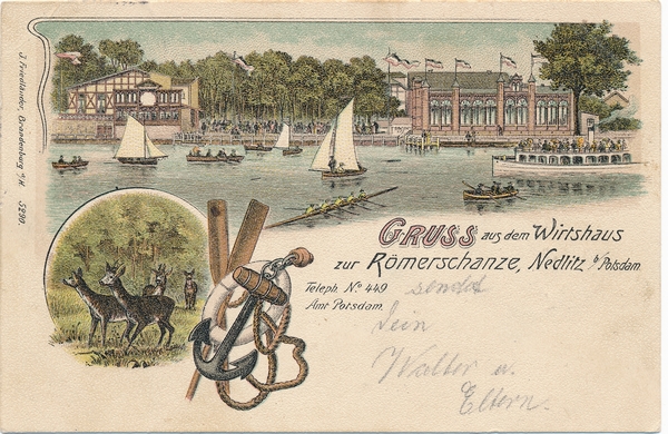 Text auf der Karte: Gruss aus dem Wirtshaus zur Römerschanze, Nedlitz b/ Potsdam. Teleph. No. 449 Amt Potsdam. Entstehungszeit der Karte: gestempelt Potsdam 31.05.1904 Kartenart: Ansichtskarte Kartentechnik: Kol. Litho Verlag: J. Friedländer, Brandenburg a/H. 5290. Gelaufen/ungelaufen: gelaufen Zustand (I=sehr gut bis V=mangelhaft): I Häufigkeit (h=häufig bis rrr=sehr selten): h