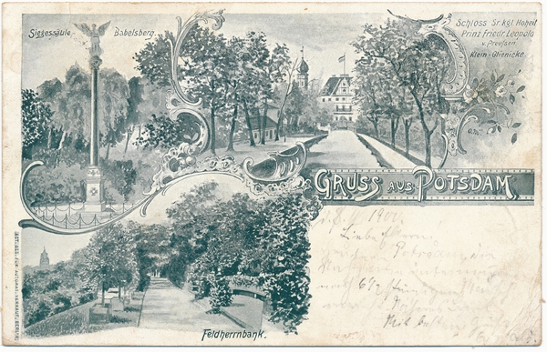 Text auf der Karte: Gruss aus Potsdam Schloss Sr. Kgl. Hoheit Prinz Friedr. Leopold v. Preussen Klein-Glienicke Siegessäule Babelsberg Feldherrnbank