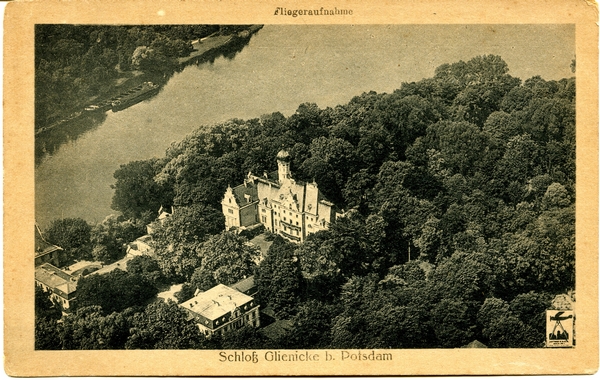 Text auf der Karte: Schloß Glienicke b. Potsdam Fliegeraufnahme Entstehungszeit der Karte: ca. 1930 Kartenart: Ansichtskarte Kartentechnik: Druck Verlag: Nr. 138 Moderner Kunstverlag G.m.b.H., Berlin Gelaufen/ungelaufen: ungelaufen Zustand (I=sehr gut bis V=mangelhaft): III Häufigkeit (h=häufig bis rrr=sehr selten): h Heutige(r) Straßenname(n): Waldmüllerstraße