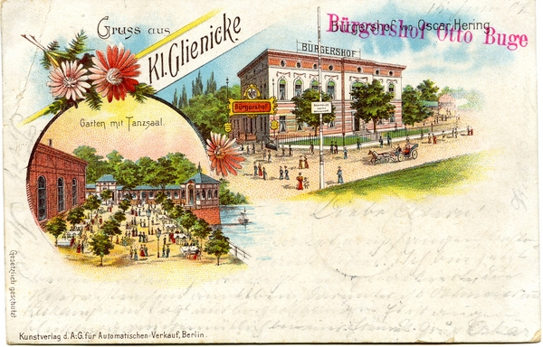 Text auf der Karte: Gruss aus Kl. Glienicke. Bürgershof von Oscar Hering (überstempelt: Bürgershof Otto Buge) Entstehungszeit der Karte: gestempelt 16.06.1902 Straße und Hausnummer: Kurfürstenstraße (Klein-Glienicke) 4/5 Kartenart: Ansichtskarte Kartentechnik: Kol. Litho Verlag: Kunstverlag d. A.G. für Automatischen Verkauf, Berlin Gelaufen/ungelaufen: gelaufen Zustand (I=sehr gut bis V=mangelhaft): II Häufigkeit (h=häufig bis rrr=sehr selten): h Heutige(r) Straßenname(n): Waldmüllerstraße Kommentar: Im Jahre 1886 wurde das straßenseitige Hauptgebäude im Florentiner Renaissance-Stil von dem Potsdamer Hofbau- und Hofmaurermeister Friedrich Ernst Petzholtz (*1839 +1904) errichtet. 1971 erfolgte der Abriß.