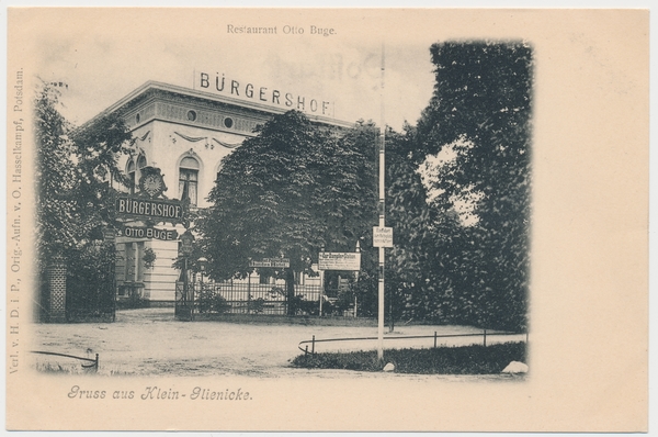 Text auf der Karte: Gruss aus Klein-Glienicke. Entstehungszeit der Karte: ca. 1900 Straße und Hausnummer: Kurfürstenstraße (Klein-Glienicke) 4/5 Kartenart: Ansichtskarte Kartentechnik: SW-Litho Verlag: Verl. v. H. D. i. P., Orig.-Aufn. v. O. Hasselkampf, Potsdam. Gelaufen/ungelaufen: ungelaufen Zustand (I=sehr gut bis V=mangelhaft): I Häufigkeit (h=häufig bis rrr=sehr selten): h Heutige(r) Straßenname(n): Waldmüllerstraße Kommentar: Im Jahre 1886 wurde das straßenseitige Hauptgebäude im Florentiner Renaissance-Stil von dem Potsdamer Hofbau- und Hofmaurermeister Friedrich Ernst Petzholtz (*1839 +1904) errichtet. 1971 erfolgte der Abriß.