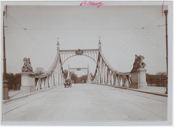 Text auf der Karte: Potsdam, Glienicker Brücke Entstehungszeit der Karte: ca. 1910 Straße und Hausnummer: Neue Königstraße Kartenart: Ansichtskartenvorlage 13x18 Kartentechnik: SW-Foto Verlag: Max Hochgeladen, Potsdam Gelaufen/ungelaufen: ungelaufen Zustand (I=sehr gut bis V=mangelhaft): I Häufigkeit (h=häufig bis rrr=sehr selten): rrr Heutige(r) Straßenname(n): Glienicker Brücke Kommentar: Schinkels Glienicker Brücke, eine Bogenbrücke mit zehn Stromöffnungen und einer hochklappbaren elften Öffnung in der Mitte als Durchfahrt für die Schiffe, wurde am 30.09.1834 in Anwesenheit der Zarin Alexandra Feodorowna, der ältesten, als Prinzessin Charlotte geborenen Tochter Friedrich Wilhelms III., eingeweiht. 70 Jahre später erfolgte der Abriß. (Quelle: Bohle-Heintzenberg, Sabine / Hamm, Manfred Die Berliner Vorstadt, Berlin 1995, Seite 14)
