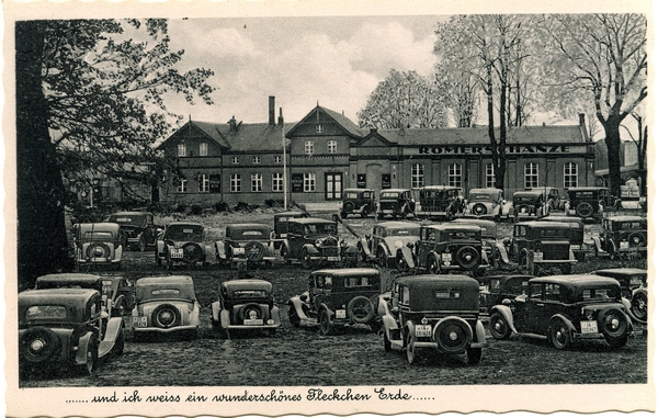 Text auf der Karte: … und ich weiss ein wunderschönes Fleckchen Erde … rückseitig: Wirtshaus zur Römerschanze Inhaber: Paul Bosek, Nedlitz bei Potsdam Fernsprecher: 3778