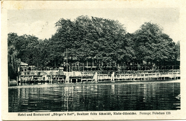 Text auf der Karte: Hotel und Restaurant "Bürger's Hof", Besitzer Fritz Schmidt, Klein Glienicke. Fernspr. Potsdam 128 Entstehungszeit der Karte: gestempelt 14.05.1921 Straße und Hausnummer: Kurfürstenstraße (Klein-Glienicke) 4/5 Kartenart: Ansichtskarte Kartentechnik: SW-Foto Verlag: Foto u. Verlag Max Hochgeladen, Potsdam Gelaufen/ungelaufen: gelaufen Zustand (I=sehr gut bis V=mangelhaft): II Häufigkeit (h=häufig bis rrr=sehr selten): h Heutige(r) Straßenname(n): Waldmüllerstraße
