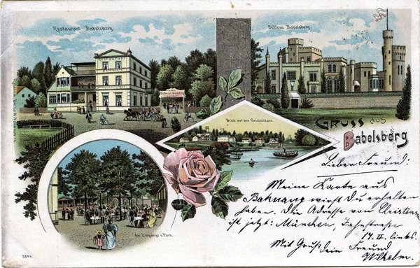 Text auf der Karte: Gruss aus Babelsberg Restaurant Babelsberg Schloss Babelsberg Am Eingange z. Park. Blick auf den Griebnitzsee