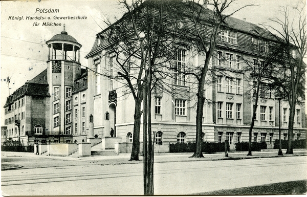 Text auf der Karte: Potsdam Königl. Handels- u. Gewerbeschule für Mädchen Entstehungszeit der Karte: gestempelt 02.09.1908 Straße und Hausnummer: Neue Königstraße 90-91 (heute: 114 Kartenart: Ansichtskarte Kartentechnik: SW-Litho Verlag: Verlag: Atelier Schröter, Inh. Willy Krüger, Potsdam. Gelaufen/ungelaufen: gelaufen Zustand (I=sehr gut bis V=mangelhaft): I Häufigkeit (h=häufig bis rrr=sehr selten): h Heutige(r) Straßenname(n): Berliner Straße Kommentar: Die Handels- und Gewerbeschule wurd 1889 in Köpenick von Johanna Just als private "Frauengewerbe-, Haushalts- und Kochschule" gegründet., die 1894 nach Potsdam umsiedelte. Am 1. April 1904 übernahm sie der Staat als "Köngliche Handels- und Gewerbeschule für Mädechen". Ein Schulneubau wurde 1905/1906 erforderlich und ein fünfgeschossiger Neobarockbau mit 226 Räumen errichtet, der 1908 eingeweht wurde. Seit 1991 ist in dem von 1997 bis 1999 sanierten Gebäude das Oberstufenzentrum III untergebracht. (Quelle: Wernicke, Thomas; Götzmann, Jutta; Winkler, Kurt (Herausgeber) Potsdam Lexikon Stadtgeschichte von A bis Z, Berlin, 2010, Seite 196)