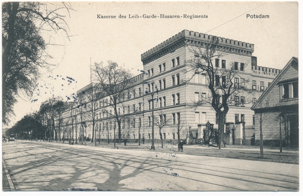 Text auf der Karte: Potsdam Kaserne des Leib-Garde-Husaren-Regiments Entstehungszeit der Karte: gestempelt Potsdam 02.04.1910 Straße und Hausnummer: Neue Königstraße Kartenart: Ansichtskarte Kartentechnik: SW-Litho Verlag: unbekannt (Signet L) Gelaufen/ungelaufen: gelaufen Zustand (I=sehr gut bis V=mangelhaft): I Häufigkeit (h=häufig bis rrr=sehr selten): h Heutige(r) Straßenname(n): Berliner Straße Kommentar: Die Kaserne an der Berliner Straße 27 wurde 1839 bis 1842 durch Johann Georg Carl Hampel unter Beteiligung von Karl Friedrich Schinkel und Ludwig Persius als lang gestreckter, sparsam gegliederter Komplex im "normannischen Stil" mit aufgesetztem Zinnenkranz erbaut. Die Eckrisalite wurden als gedrungene Wehrtürme gestaltet. Die Bauherren waren König Friedrich Wilhelm III. und König Friedrich Wilhelm IV. 1886/1887 erhielt die Kaserne eine eigene Offizierspeiseanstalt (Kasino). Die Kaserne wurde bis 1919 vom Leib-Garde-Husaren-Regiment, danach von der Reichswehr bzw. der Wehrmacht genutzt. Nach 1945 waren zunächst sowjetische Truppen, dann Einheiten der Nationalen Volksarmee in der Kaserne stationiert. Seit Ende 1990 befindet sich das Kreiswehrersatzamt der Bundeswehr in der Kaserne. Der zur Kaserne gehörige Komplex der Reitställe und Reitbahnen (1822 von Schinkel angelegt) ist durch den Bau der Zufahrt zur Haumboldt-Brücke weitgehend zerstört worden. Die erhaltenen Stallgebäude werden heute zivil genutzt. (Quelle: Wernicke, Thomas; Götzmann, Jutta; Winkler, Kurt (Herausgeber) Potsdam Lexikon Stadtgeschichte von A bis Z, Berlin, 2010, Seite 223)