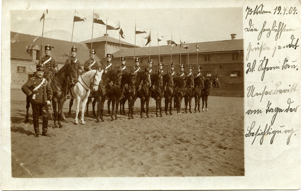 Text auf der Karte: Hof der Leib-Garde-Husaren-Kaserne, Potsdam Entstehungszeit der Karte: gestempelt Potsdam 19.04.1904 Straße und Hausnummer: Neue Königstraße Kartenart: Ansichtskarte Kartentechnik: SW-Foto Verlag: unbekannt Gelaufen/ungelaufen: gelaufen Zustand (I=sehr gut bis V=mangelhaft): I Häufigkeit (h=häufig bis rrr=sehr selten): r Heutige(r) Straßenname(n): Berliner Straße