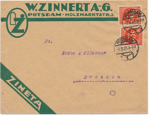 Text auf der Karte: Kuvert der W. Zinnert A.-G. Entstehungszeit der Karte: gestempelt Potsdam 03.08.1923 Straße und Hausnummer: Holzmarktstraße 2 Kartenart: Kuvert Kartentechnik: Druck Verlag: unbekannt Gelaufen/ungelaufen: gelaufen Zustand (I=sehr gut bis V=mangelhaft): I Häufigkeit (h=häufig bis rrr=sehr selten): h Heutige(r) Straßenname(n): Holzmarktstraße