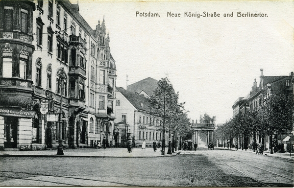Text auf der Karte: Potsdam. Neue König-Straße und Berlinertor. Entstehungszeit der Karte: ca. 1910 Straße und Hausnummer: Neue Königstraße Kartenart: Ansichtskarte Kartentechnik: SW-Litho Verlag: Kunstverlag Robert Hügel, Berlin SW. 48. No. 1711 Gelaufen/ungelaufen: ungelaufen Zustand (I=sehr gut bis V=mangelhaft): I Häufigkeit (h=häufig bis rrr=sehr selten): r Heutige(r) Straßenname(n): Berliner Straße Holzmarktstraße Kommentar: Die sich an das Berliner Tor anschließende Neue Königstraße wurde nach 1900 dichter besiedelt. (Quelle: Griep, Otto (Hrsg.) Potsdam in alten Ansichtskarten, Würzburg 1992, Seite 24)