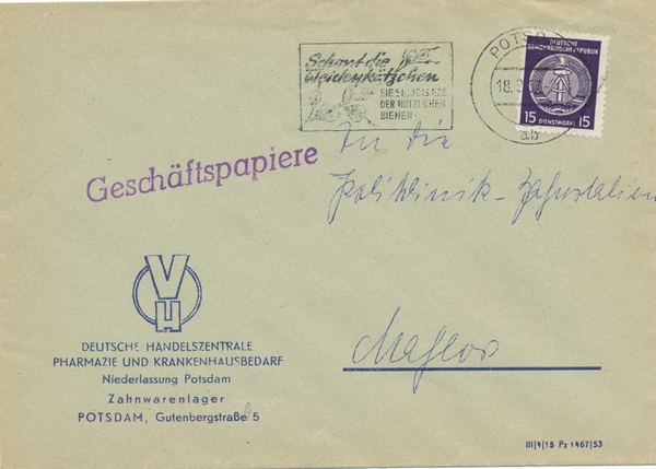 Text auf der Karte: Kuvert der Deutsche Handelszentrale Pharmazie und Krankenhausbedarf Niederlassung Potsdam Zahnwarenlager Potsdam, Gutenbergstr. 5 Entstehungszeit der Karte: gestempelt Potsdam 18.02.1967 Straße und Hausnummer: Gutenbergstraße 5 Kartenart: Kuvert Kartentechnik: Druck Verlag: III/4/15 Pz 1467/53 Gelaufen/ungelaufen: gelaufen Zustand (I=sehr gut bis V=mangelhaft): I Häufigkeit (h=häufig bis rrr=sehr selten): h Heutige(r) Straßenname(n): Gutenbergstraße