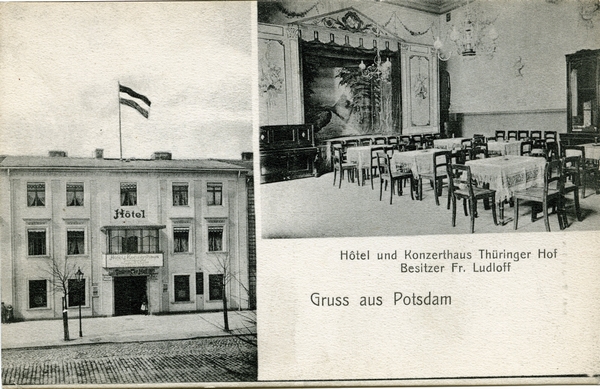 Text auf der Karte: Gruss aus Potsdam Hôtel und Konzerthaus Thüringer Hof Besitzer Fr. (Anna) Ludloff Entstehungszeit der Karte: ca. 1908 Straße und Hausnummer: Waisenstraße (heute Dortustraße) 4 Kartenart: Ansichtskarte Kartentechnik: SW-Litho Verlag: 6095 Verlag: Richard Optiz, Potsdam Gelaufen/ungelaufen: ungelaufen Zustand (I=sehr gut bis V=mangelhaft): I Häufigkeit (h=häufig bis rrr=sehr selten): r Heutige(r) Straßenname(n): Dortustraße